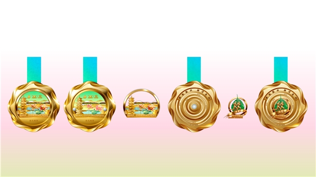 今年奖牌的最大亮点,在于其创新的“可拆卸、多功能”设计。奖牌整体造型圆润饱满,边缘采用花瓣形态,既规整又灵动。正面是一幅可拆卸的冰箱贴,图案融合了新兴体育中心、国恩寺、荷花等本地标志性元素,色彩明快、层次丰富,生动呈现了新兴的自然与人文风貌。奖牌背面的赛事Logo同样可以拆卸,作为独立的冰箱贴使用。奖牌整体小巧精致,更方便跑友随身携带,让赛事记忆伴随左右。