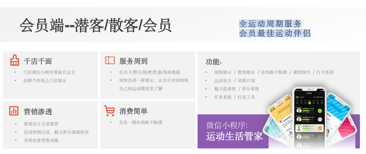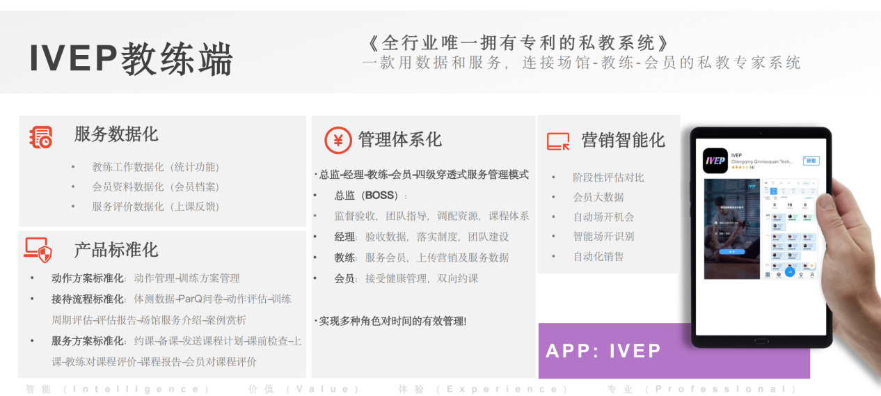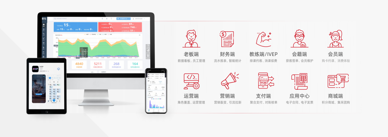 老板端的数据看板可实时查看营收、会员活跃度等关键数据,无需手动统计,一键生成多维度报表,让经营者随时掌握场馆运营状况;教练端支持排课约客、消课续费,还搭载IVEP私教专家系统,以AI科技为私教赋能,实现私教产品化、标准化,助力本地场馆打造差异化优势,提升会员留存率;会籍端支持线上审批/开卡/核单/交定金,让会籍把握住每一次潜客的消费冲动,增加场馆收入,协同工作更加简单;会员端可实现会员一键购卡购课、合同签订、体测查询、积分兑换、付费团课、合同签订等功能,真正做到了会员全运动周期服务,是门店会员的最佳运动伴侣。