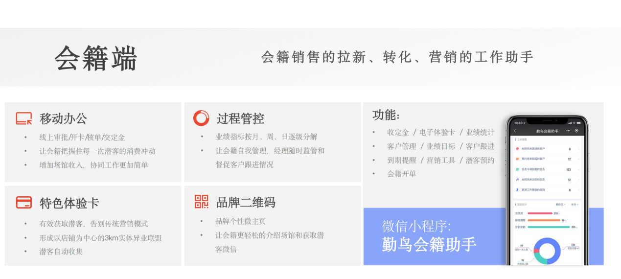勤鸟健身房管理系统的核心优势,在于“全场景适配+本地化服务+平台流量赋能”,完美契合本地场馆的运营需求。作为专注健身行业数字化转型的体育数字服务商,勤鸟覆盖了本地场馆所需的全核心功能,系统拥有五大端口:BOSS/老板端、教练端(IVEP)、会籍端、会员端以及PC端。