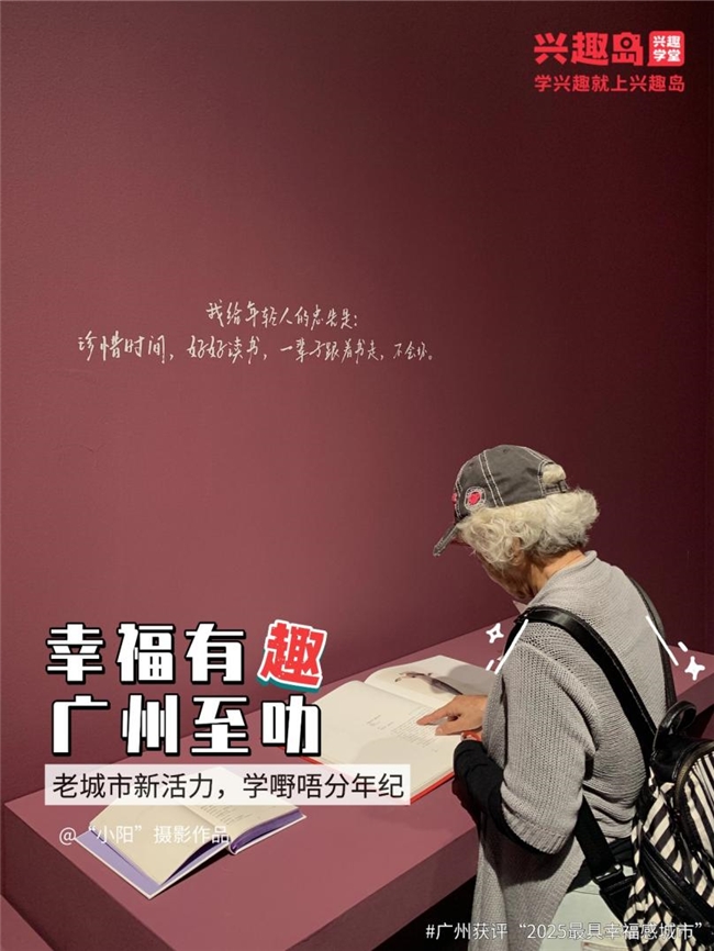 从“民生七有”到“精神富有”,从“全龄友好”到“共建共治共享”,广州正以“二次创业、勇立潮头”的姿态,书写老城市新活力的幸福答卷。兴趣岛正是以在线兴趣学习平台为载体,为普通人构建一所没有围墙的“幸福精神乐园”,这不仅是对个体生命尊严、文化归属与终身成长的真诚回应,更折射出一座超大城市以人为本、向美而行的深切关怀。它既是国家“积极老龄化”“全民终身学习”战略在广州落地的生动缩影,也是“四个出新出彩”中“城市文明出新出彩”的微观实践。让发展有力度,也让幸福有温度;让日子有奔头,也让生活有味道、有光芒、有回响。